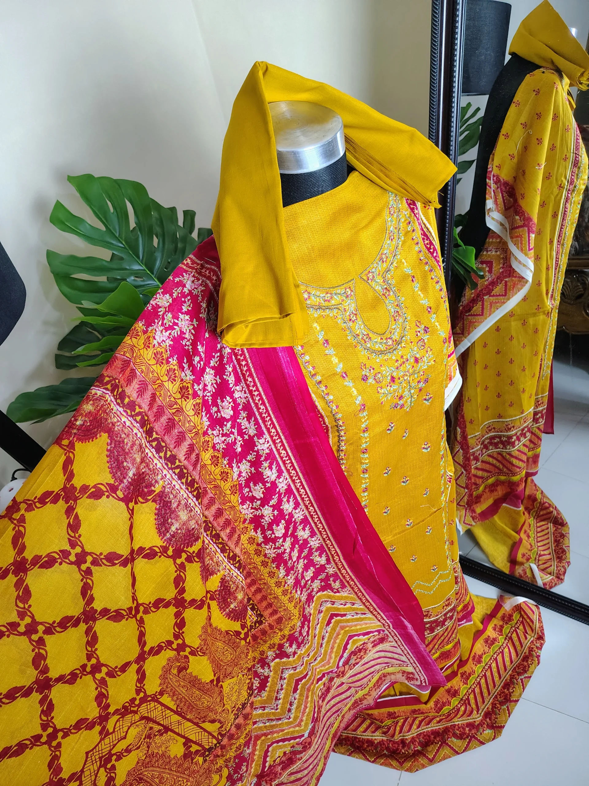 এম্ব্রয়ডারি কটন থ্রি-পিস কালেকশন (৪ কালার ভ্যারিয়েন্ট) – মাস্টার্ড ইয়েলো, রেড, পার্পল ও গোল্ডেন কম্বিনেশন। প্রিমিয়াম ফেব্রিক ও স্টাইলিশ এমব্রয়ডারি ডিজাইনের ড্রেস কালেকশন।